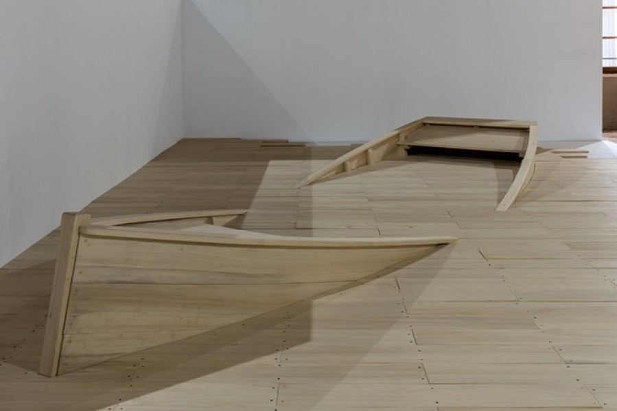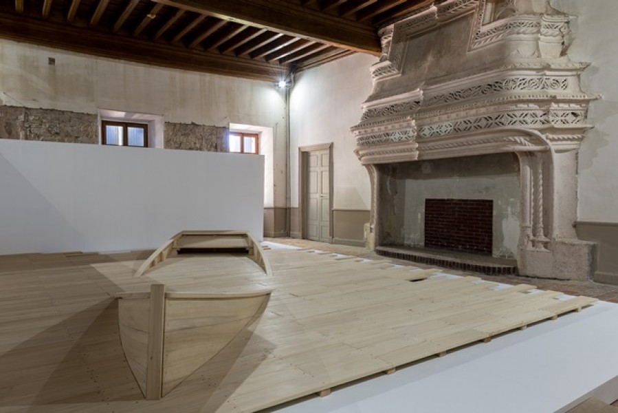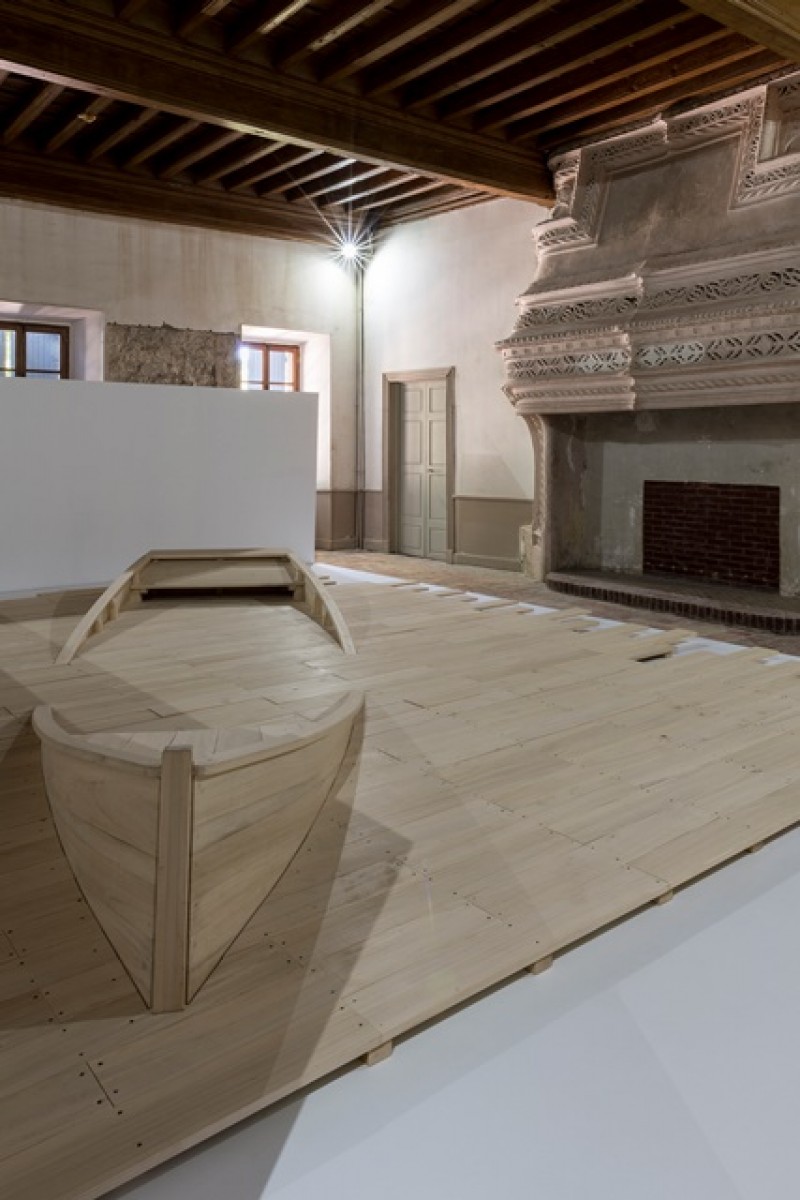 Cette installation, réalisée à partir de techniques de charpente navale, mobilise l’imaginaire sur un mode mémoriel. Peintures romantiques, photographies des grandes crues des XIXe et du XXe siècles, ou encore reportages d’un passé récent sous l’angle du dérèglement climatique : des images déjà vues semblent ici sédimentées en un paysage parcellaire, en cours d’apparition ou en voie d’effacement. Depuis le milieu des années 1990, le lien avec la nature traverse tout le travail de Stéphane Thidet. La fiction du retour au sauvage ou encore la peur du déchaînement des éléments se retrouvent dans ses œuvres. L’artiste crée un sentiment d’étrangeté à partir de visions communes, par d’inquiétants décalages dans les habitudes de représentation. Il déstabilise ainsi les points d’ancrage et les refuges mentaux collectifs.