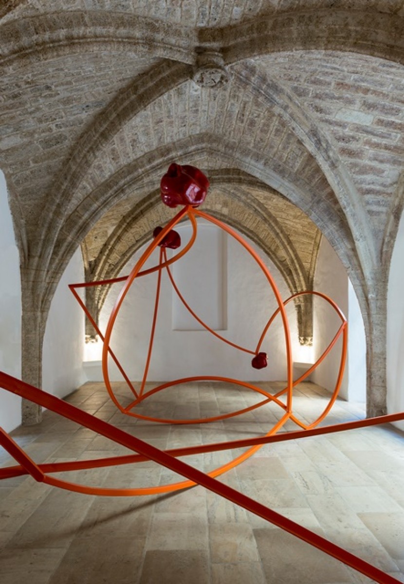 Réalisée en métal orange et en céramique rouge, la sculpture se déploiera dans tout l’espace de la salle voutée de l’hotel Flotte de Sébasan, traçant des lignes, déplaçant le regard vers des directions inattendues. Opposées au déterminisme de ces lignes d’acier, les nœuds de céramique apparaissent comme des organismes vivants, corps étrangers en symbiose avecleur tuteur. Une autre œuvre, plus modeste en dimension occupera le jardin.