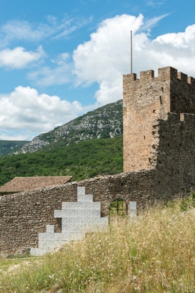 En succédant à plusieurs réalisations in situ sur le site du château de Saint-Jean-de-Buèges, Pablo Garcia a imaginé recouvrir une partie du mur d’enceinte du château de Baulx par des dalles de résine reproduisant les falaises qui surplombent le site. Inspiré par le tiling, technique de répétition d’une texture dans les jeux vidéo, ce décor s’apparente à un camouflage spécifique répétant la nature environnante, finalement proche des camouflages de la Première Guerre Mondiale, souvent très contextuels. Le titre, Doomlike, est une expression empruntée à un type de jeu vidéo de tir. La position géographique et stratégique du château renvoie directement le visiteur à une évocation de ces fonctions défensives. Ces leurres joueront évidemment sur notre perception visuelle du site mais permettront aussi, une fois entré dans l’enceinte du lieu de mieux revoir l’architecture et d’apporter une attention particulière aux murs puisque cachés au premier regard. Ainsi la falaise surplombante se reflétera aussi en quelque sorte dans le château comme un dialogue séculaire sur la modification de la nature par l’Homme.