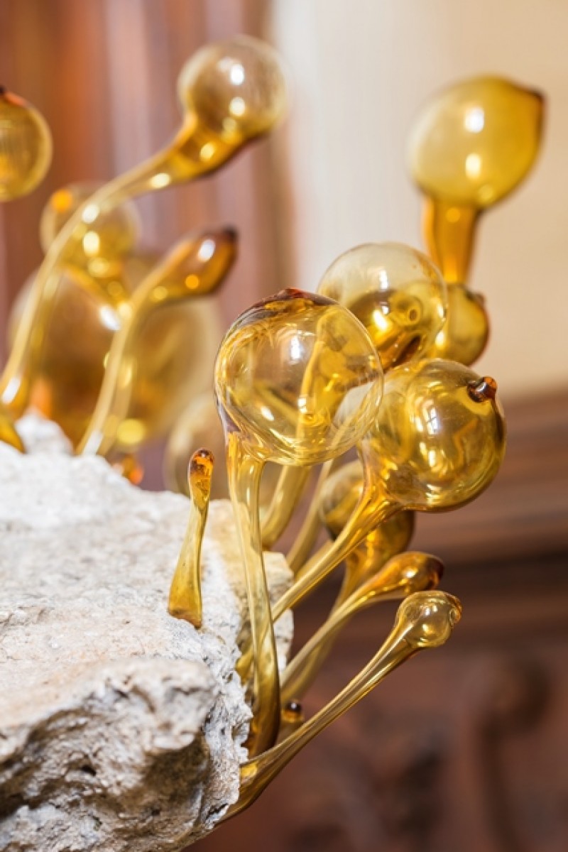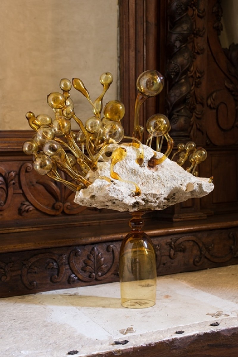 « Un certain rapport entre immobilisme et mouvement anime mes installations, qui pour la plupart, si elles ne bougent pas, sont sous tension, pèsent, poussent, serrent, relient, s’écoulent, s’épanchent, s’attient, s’aimantent. » écrit l’artiste.Les œuvres de Julie Legrand sont constituées du rapprochement improbable de matériaux bruts, éponges, cailloux, crâne, prélevés dans la nature et du verre, soufflé, filé, infiniment fragile, introduit dans les porosités minérales ou végétales, ou encore animales. De ces associations « contre nature », nait un univers sensuel et métaphorique.