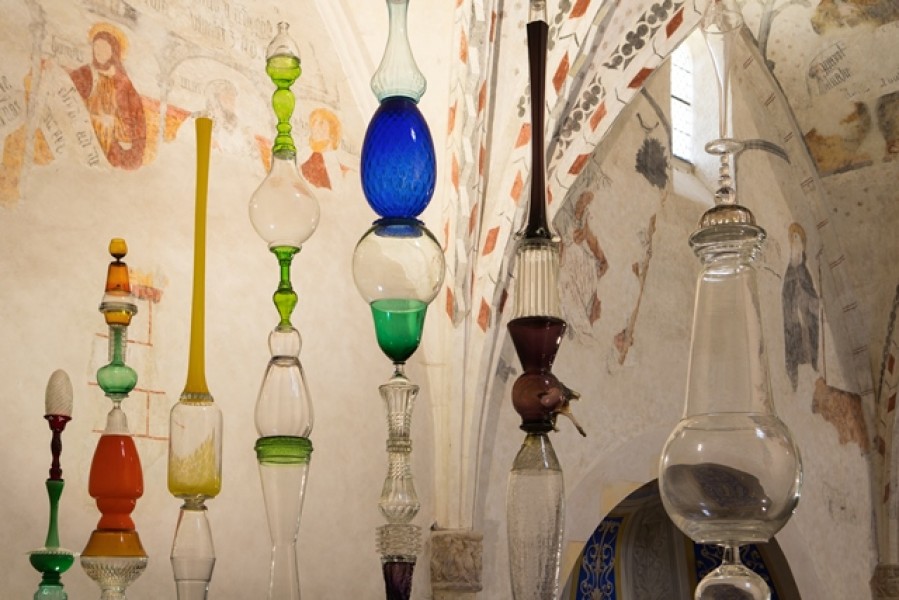 Dans trois espaces bien différenciés de la cathédrale Notre-Dame-de-la-Sède, deux chapelles et la tribune, Julie Legrand installera trois œuvres en verre, avec entre autre, un ensemble de colonnes faites de récipients d’origines diverses, empilés verticalement.