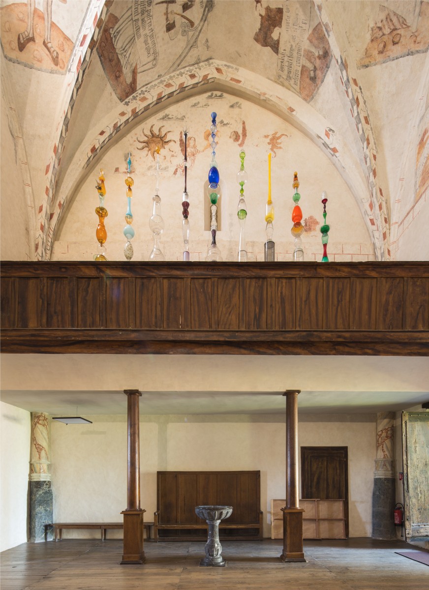 Dans la tribune, un ensemble de colonnes constituées de récipients en verre empilés, d’époques et d’origines diverses, évoque les cairns chers aux pèlerins et les ostensoirs tandis que les deux petites chapelles accueillent chacune une œuvre. L’une est constituée d’une pierre soutenue par une structure en verre verticale et haute, tandis que l’autre est nichée à la place d’un ornement liturgique au-dessus d’un autel en bois. Les œuvres de Julie Legrand se manifestent par une présence à la fois précieuse, secrète et silencieuse.